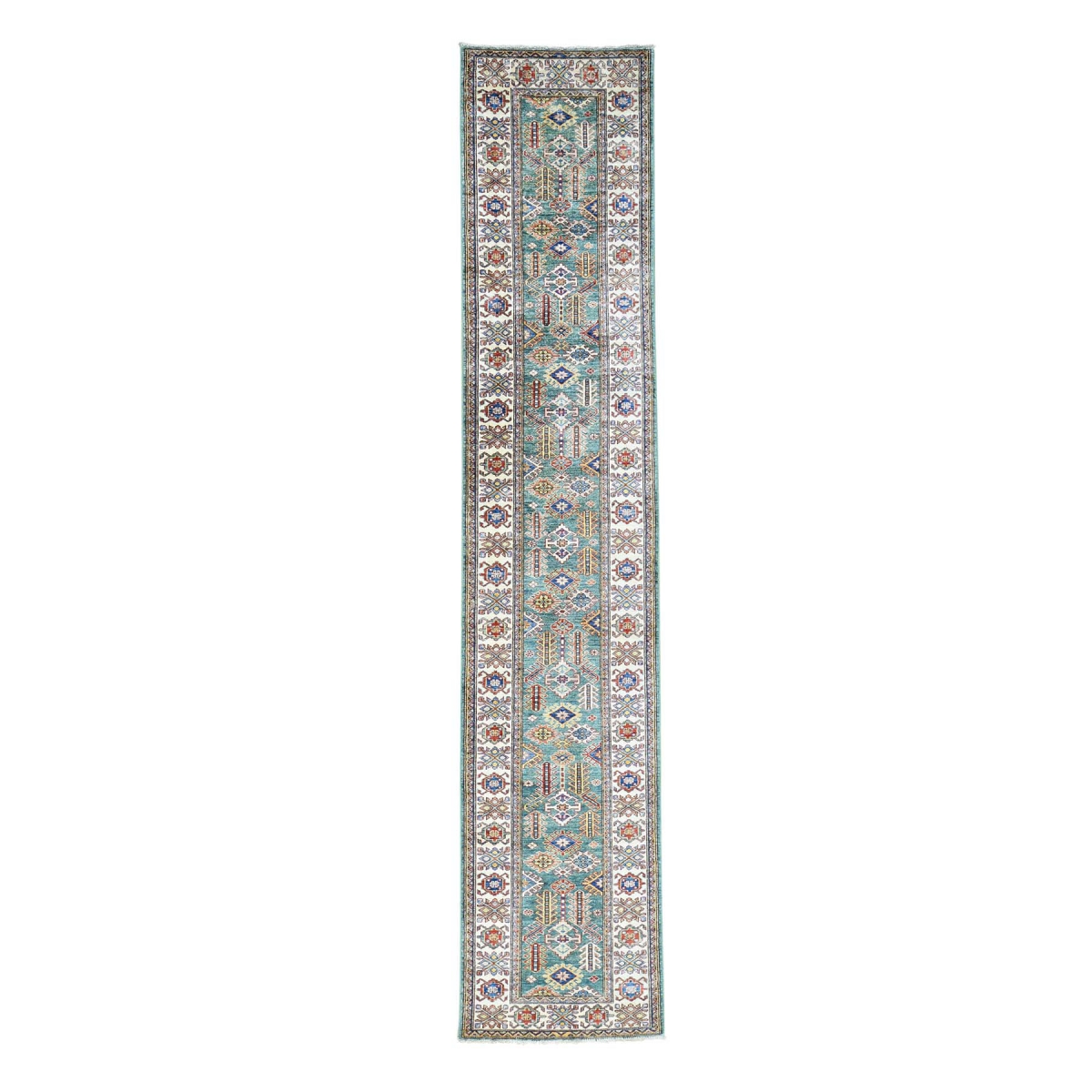 Hand-knotted green super kazak runner tribal design rug