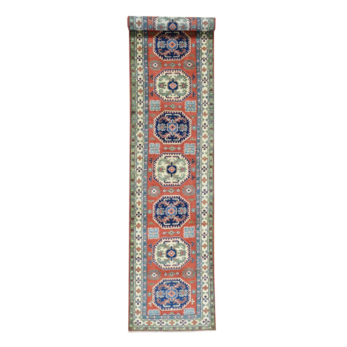 Hand-knotted geometric design kazak pure wool runner rug