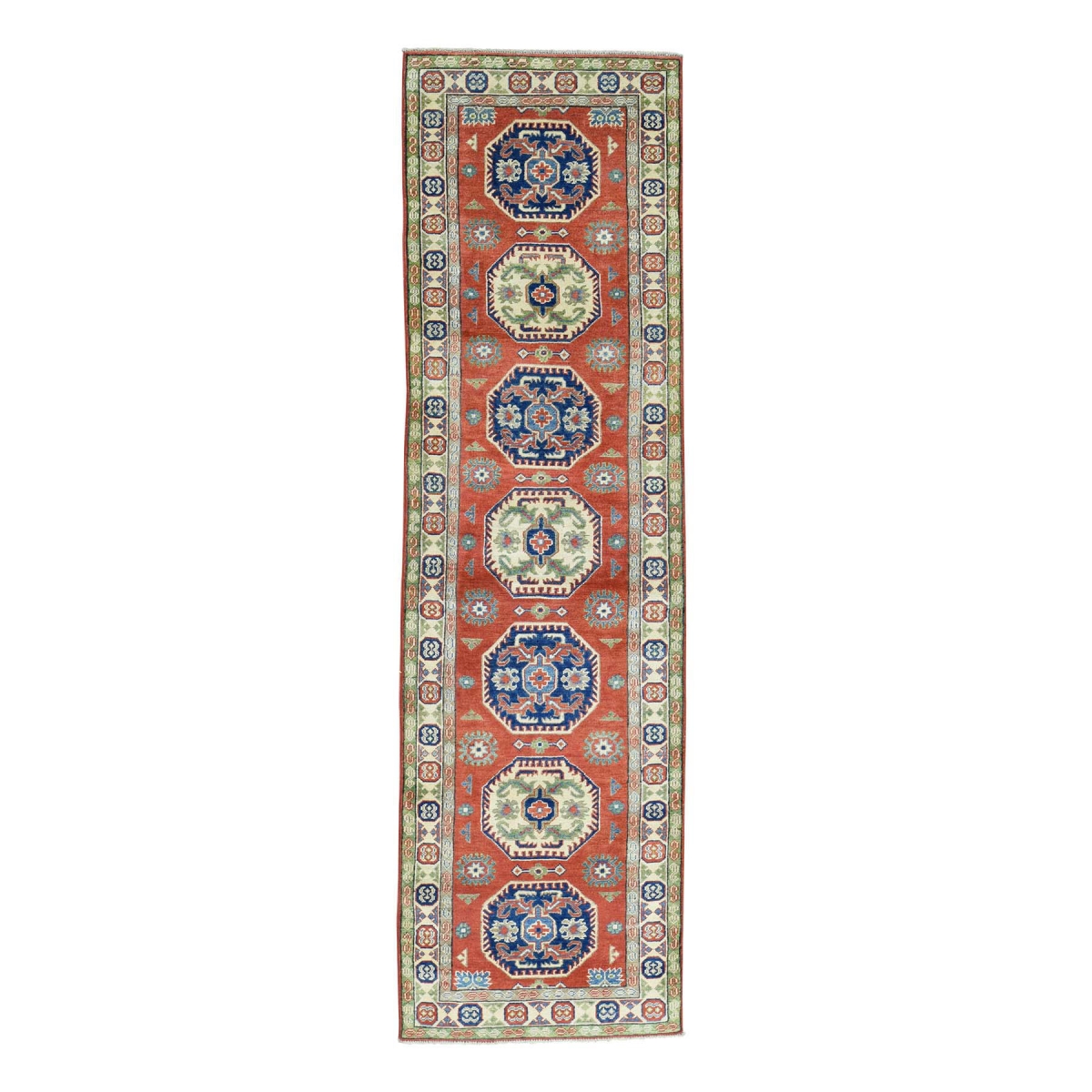 Hand-knotted red kazak tribal and geometric design runner rug