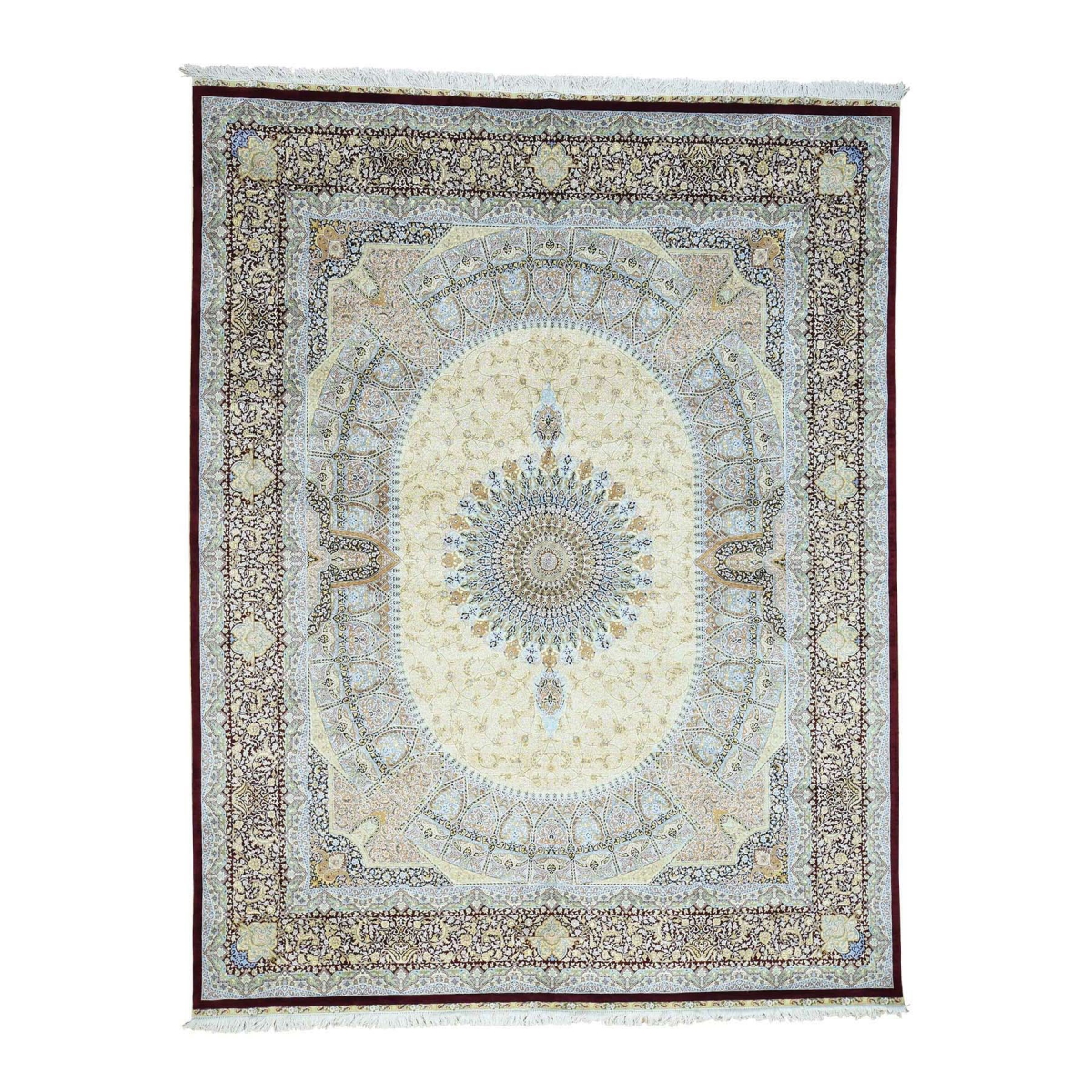 Features- This is a truly genuine one-of-a-kind gombad design pure silk 600 kpsi hand-knotted oriental rug