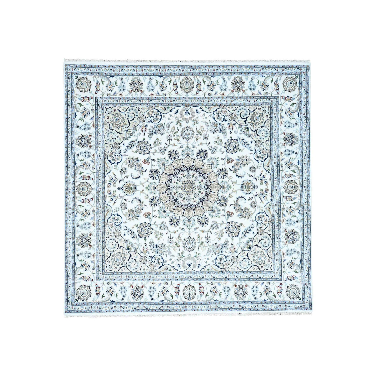 Features- This is a truly genuine one-of-a-kind hand-knotted wool and silk 250 kpsi ivory nain square rug