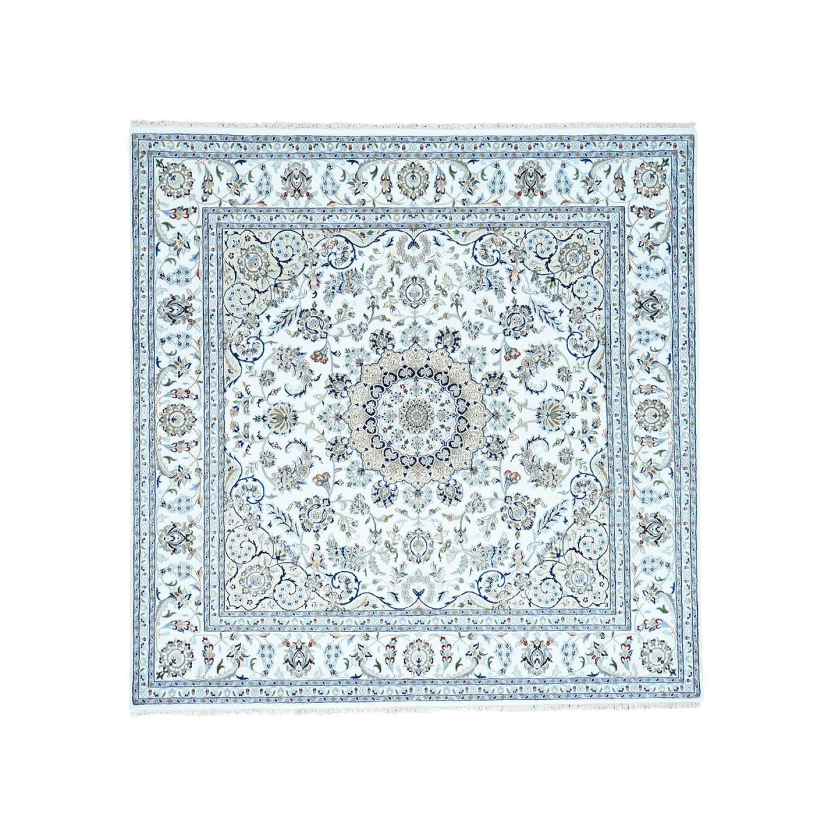 Features- This is a truly genuine one-of-a-kind hand-knotted wool and silk 250 kpsi ivory nain square rug