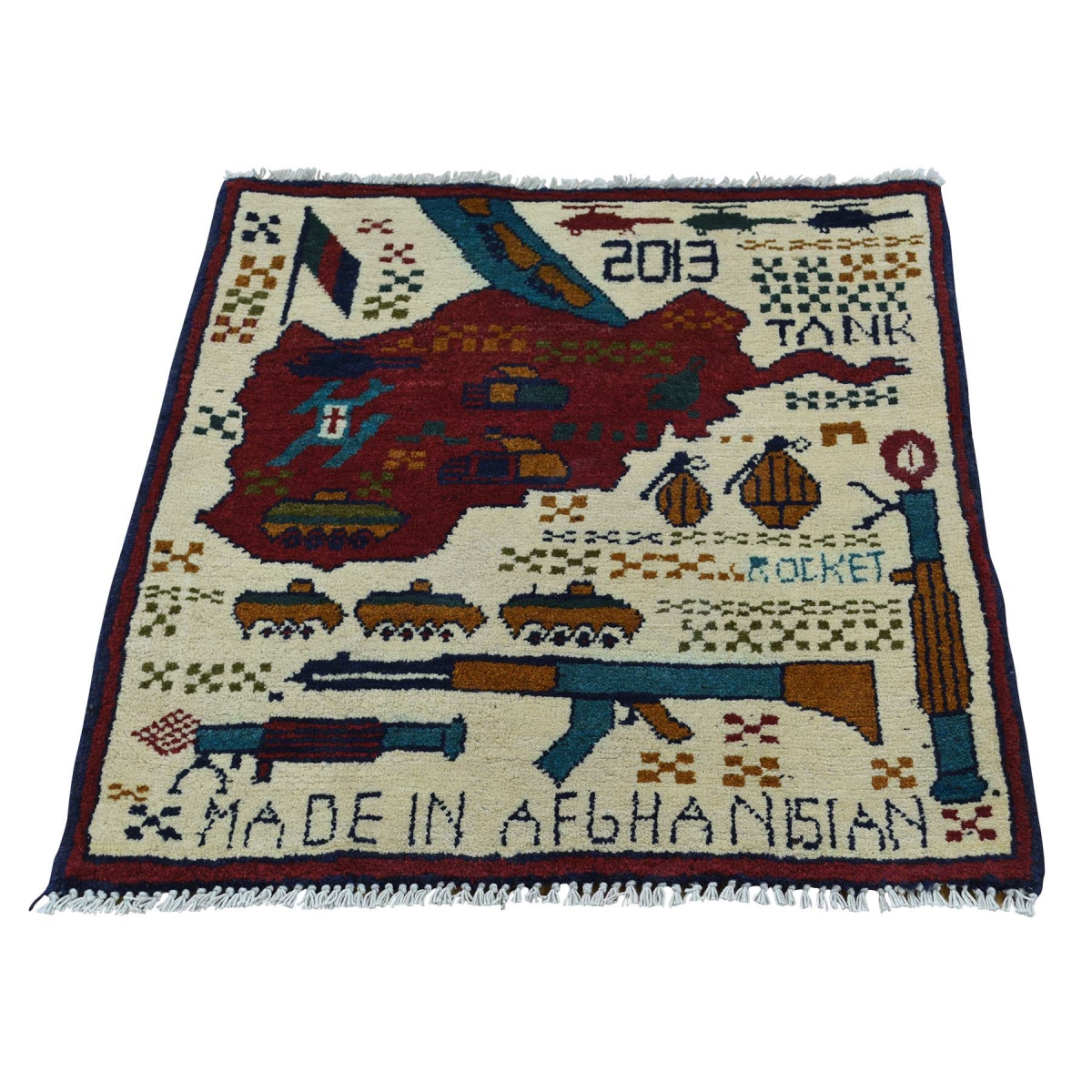 1800 Get A Rug sh35905 2 ft. x 2 ft. 2 in. Hand Knotted Afghan Baluch War Tanks Guns and Grenades Rug Ivory