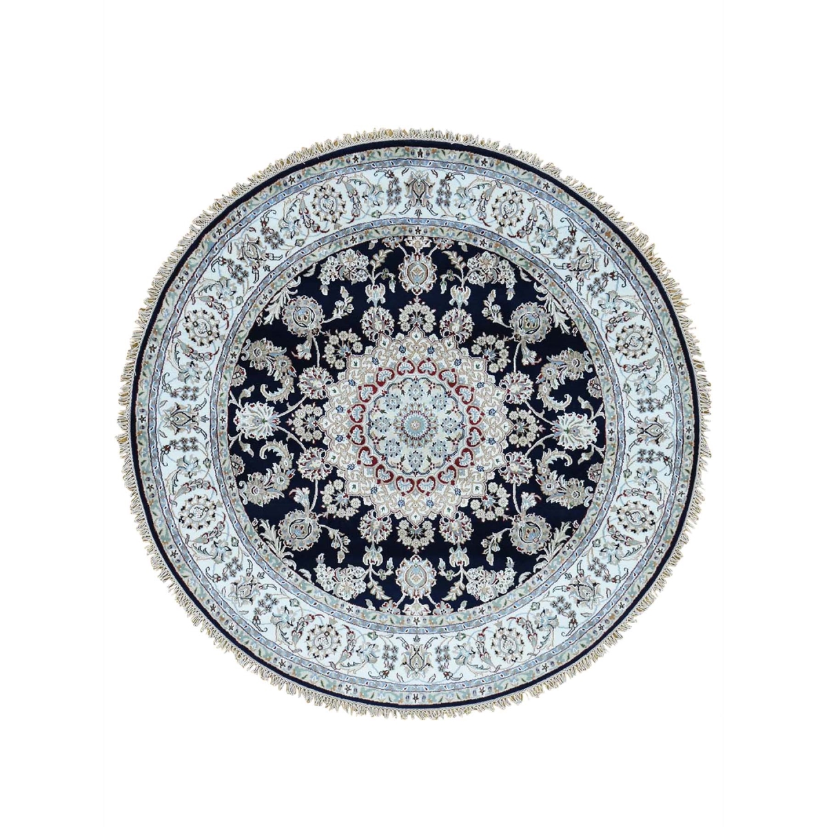 Features- This is a truly genuine one-of-a-kind hand-knotted wool and silk 300 kpsi nain round oriental rug