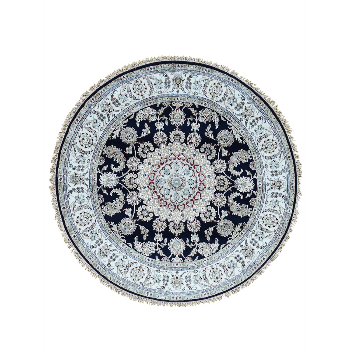 Features- This is a truly genuine one-of-a-kind hand-knotted wool and silk 300 kpsi navy round nain oriental rug