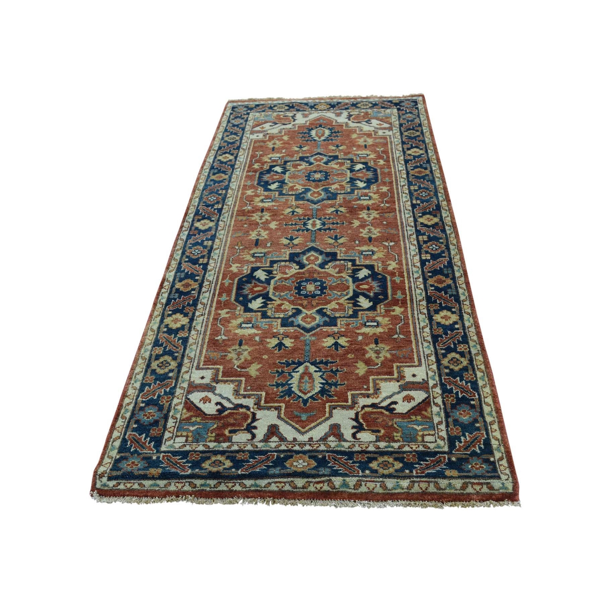Features- This is a truly genuine one-of-a-kind pure wool antiqued heriz recreation hand-knotted runner rug